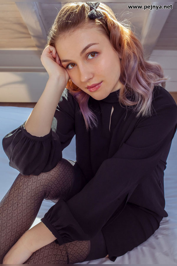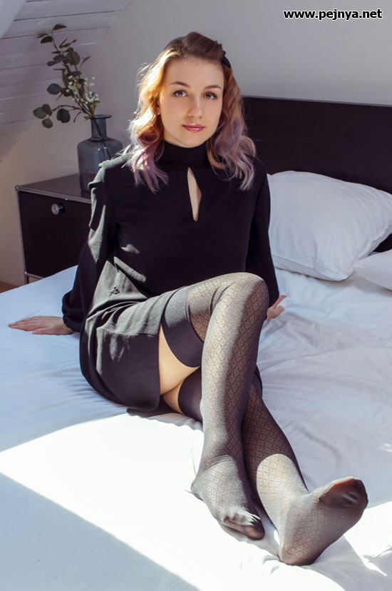 Раздевается и позирует в чулочках