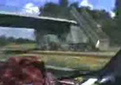 Грузовик с поднятой платформой очень быстро едет по шоссе и сносит мост