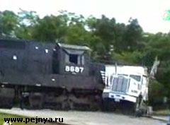 Грузовой поезд врезается в фуру.