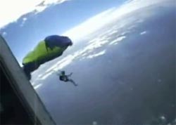 Опасен парашютный спорт. Парашютист зацепился парашютом за хвост самолёта.